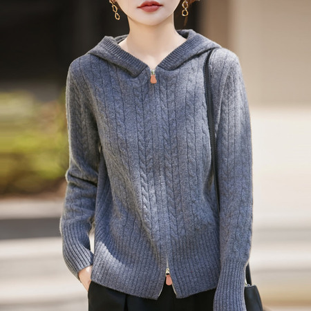 丁摩 老钱风连帽双拉链100纯羊毛针织开衫JJ-156·灰色