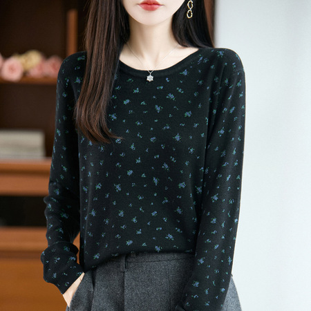 【精纺羊毛】特舒碎花宽松针织衫ts-596·黑色