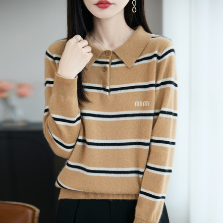 【100羊毛】特舒翻领条纹毛衣TS-2505·浅卡其
