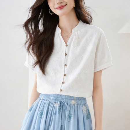 【100棉】可风各蕾丝花边镂空五分袖衬衫64108·白色