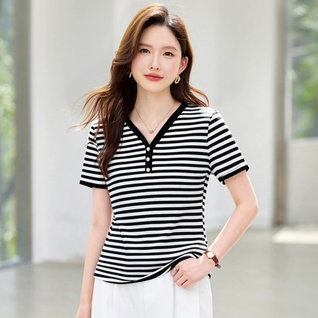 【94精梳棉】轩凌子条纹v领短袖T恤XS82620040·黑白