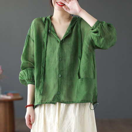 棉麻透气宽松百搭防晒连帽开衫·绿色