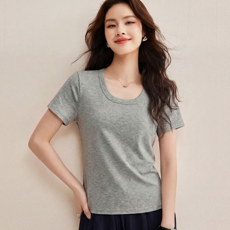 修娴U领慕斯竹节棉肌理感短袖T恤W59·深灰