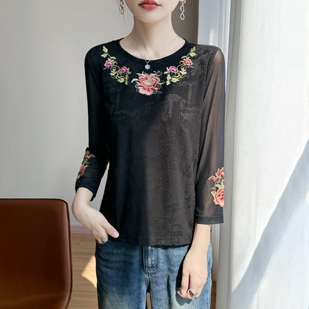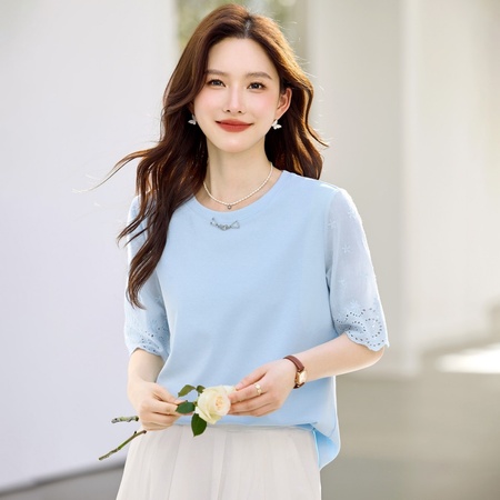 【92精梳棉】轩凌子镂空刺绣中袖T恤S82610106·天空蓝