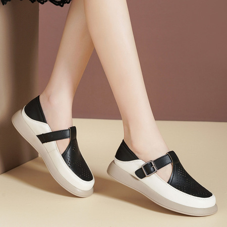 真皮镂空透气加宽圆头软底防滑时尚乐福鞋·米黑