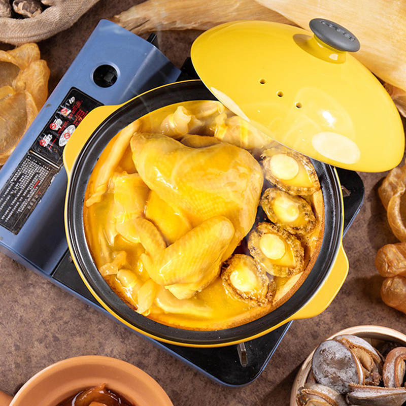 整只走地鸡,500天农家散养地鸡,肉质紧实;大片花胶,Q弹爽滑,胶多不腥。4颗深海鲍鱼,口感厚实,鲜味无穷,24小时熬制真港味。
