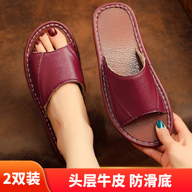 【2双装/头层牛皮】防滑家居夏款男女拖鞋·酒红+黑色