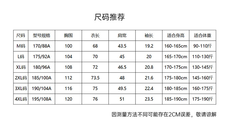 4XL 175-190斤 L 110-130斤 3XL 160-175斤 2XL 145-160斤 M 90-110斤 XL 130-145斤 尺码表