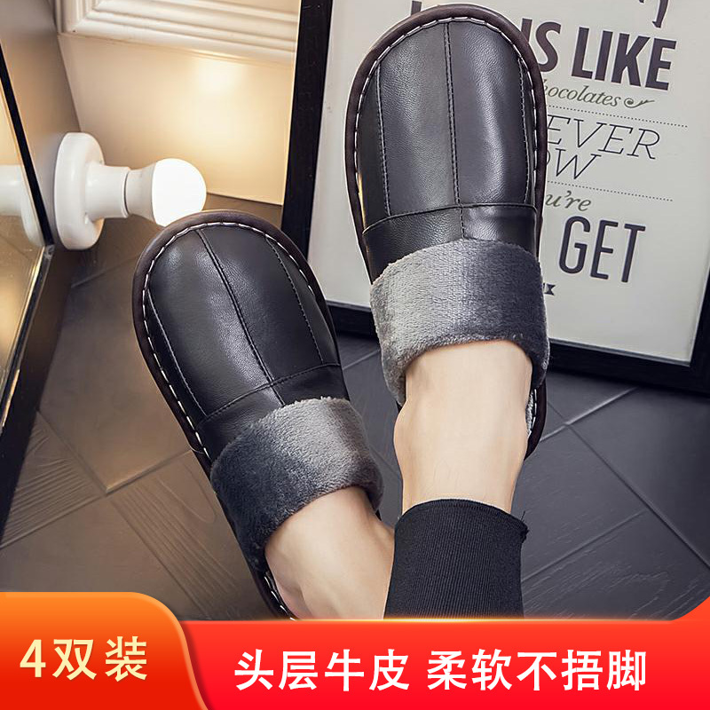 【4双装/头层羊皮】 防滑家居秋冬真皮拖鞋·黑色*4双