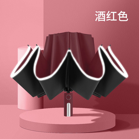 泳伶彩色手柄全自动反向伞十骨三折带反光条晴雨伞·酒红色
