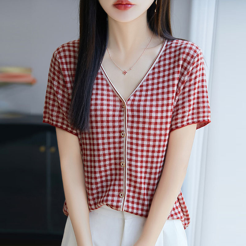 【爆款特价】100赛莱尔天丝格纹提花气质减龄显瘦短袖·V领红色