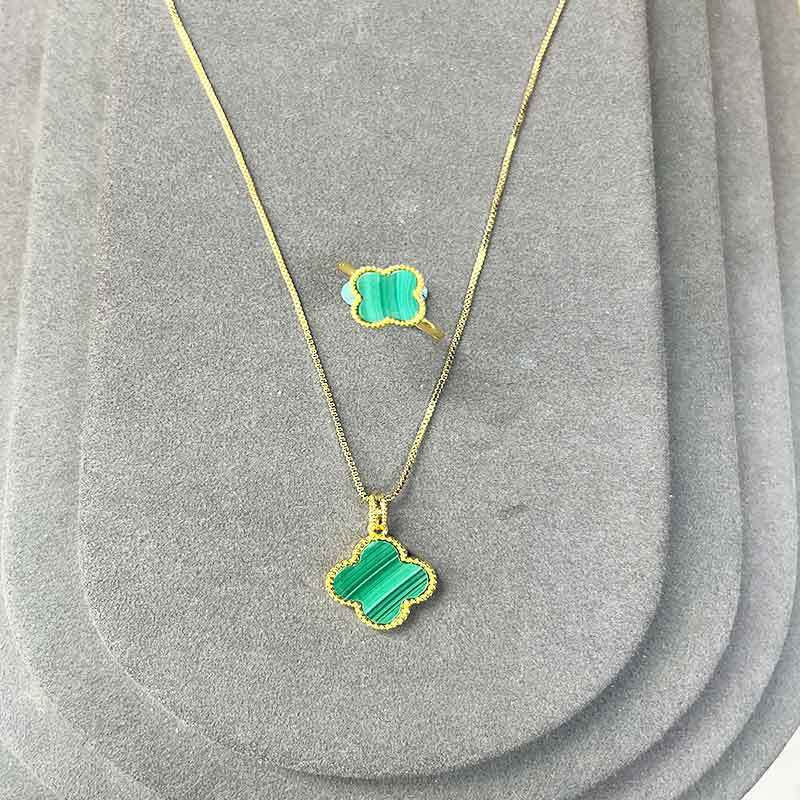 孔雀石四叶草吊坠戒指套组