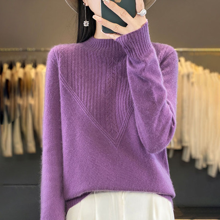 高密针织羊毛一线成衣半高领绞花针织衫·深紫色