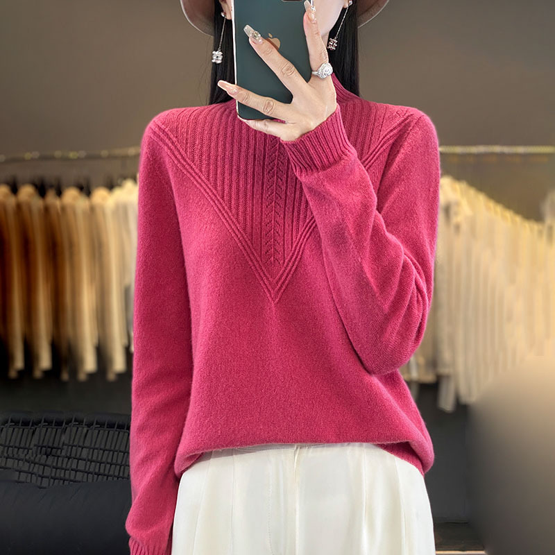 高密针织羊毛一线成衣半高领绞花针织衫·树莓红