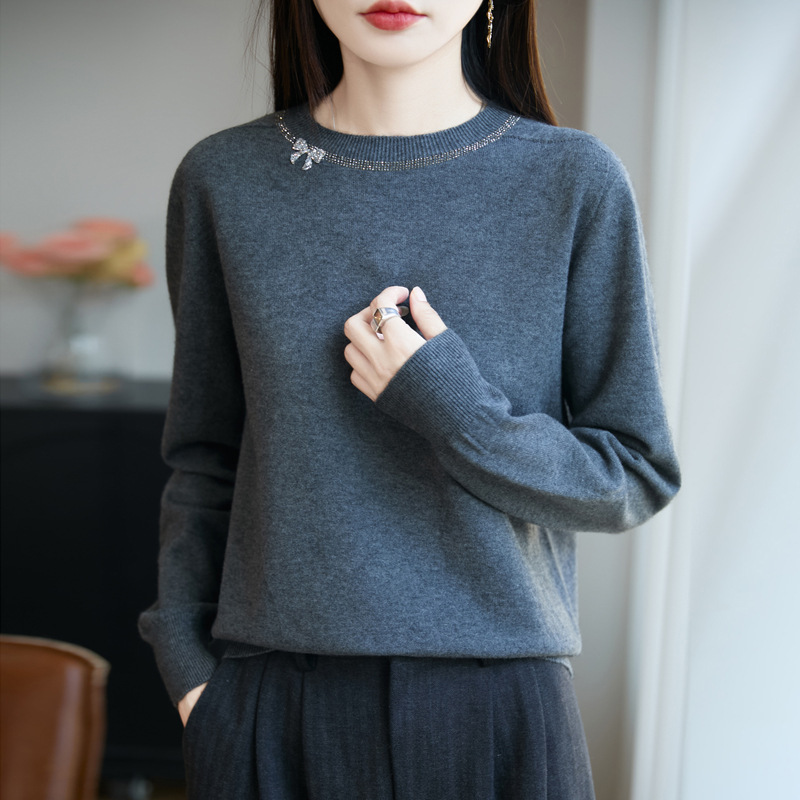 【新款特价】精纺羊毛蝴蝶镶钻显瘦百搭圆领针织衫·深灰