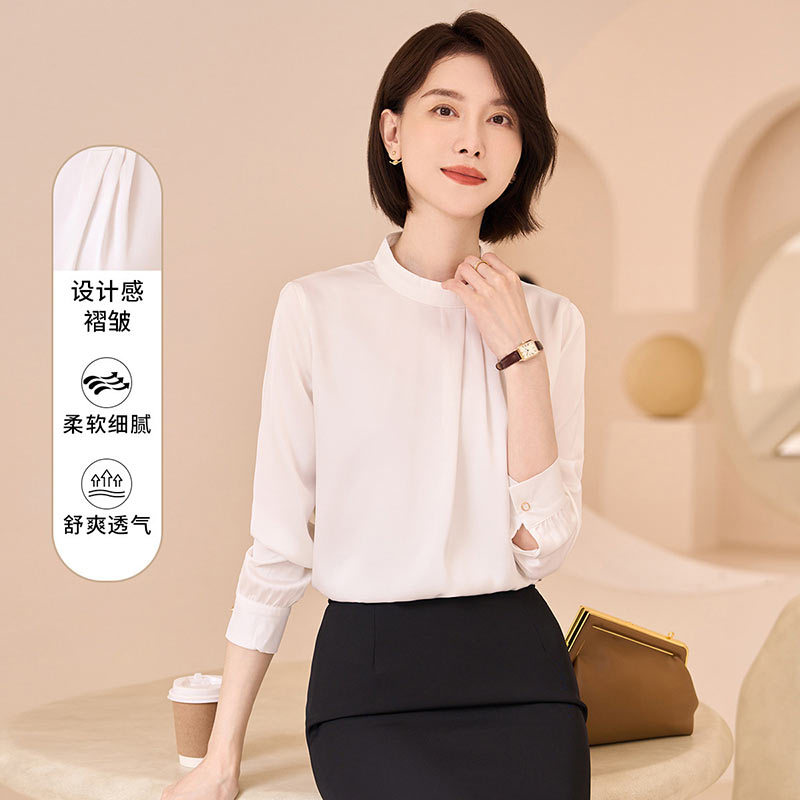 罗蒙圆领气质长袖衬衫女商务休闲通勤质感纯色99XCM60C01·白色