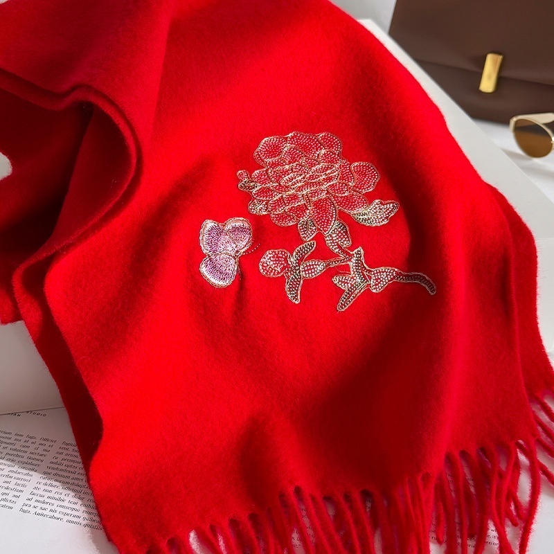 【100羊毛】普春牡丹刺绣围巾YM-085·大红