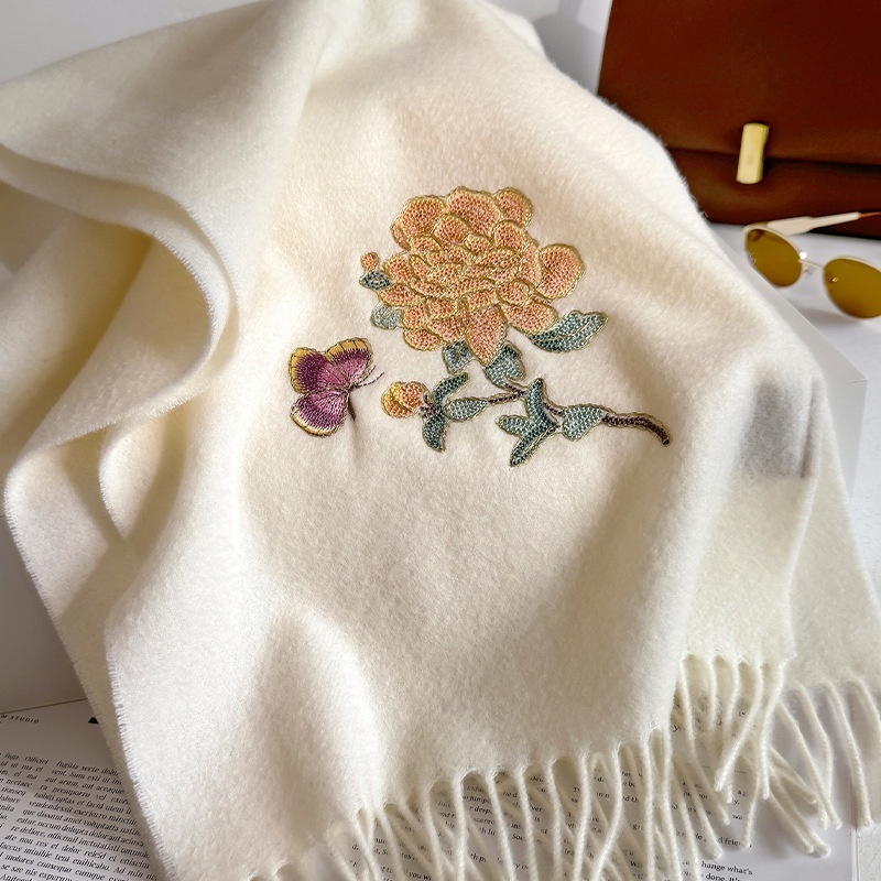 【100羊毛】普春牡丹刺绣围巾YM-085·白色