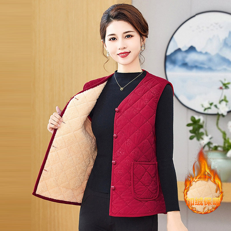 时尚格纹提花开扣加绒加厚保暖马甲·酒红色
