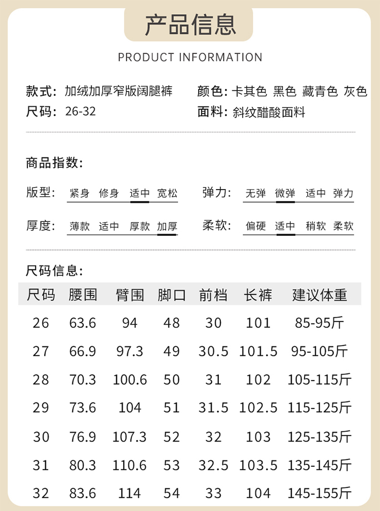 26(85-95斤) 32(145-160斤) 28(105-115斤) 31(135-145斤) 30(125-135斤) 27(95-105斤) 29(115-125斤) 尺码表