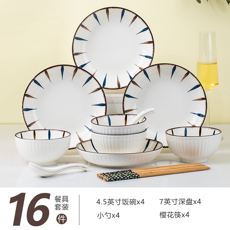 康琴·日式釉下彩碗碟餐具套装蓝禾16件套【4碗+4盘+4勺+4筷】
