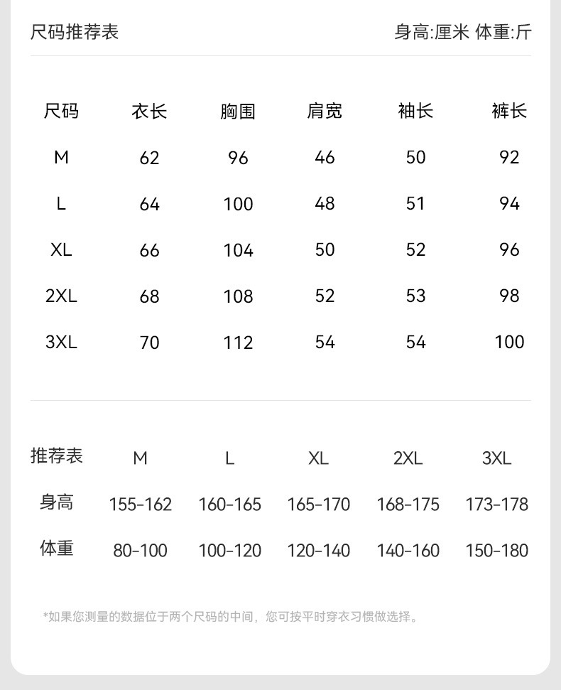 M建议80-100斤 3XL建议160-180斤 L建议100-120斤 2XL建议140-160斤 XL建议120-140斤 尺码表