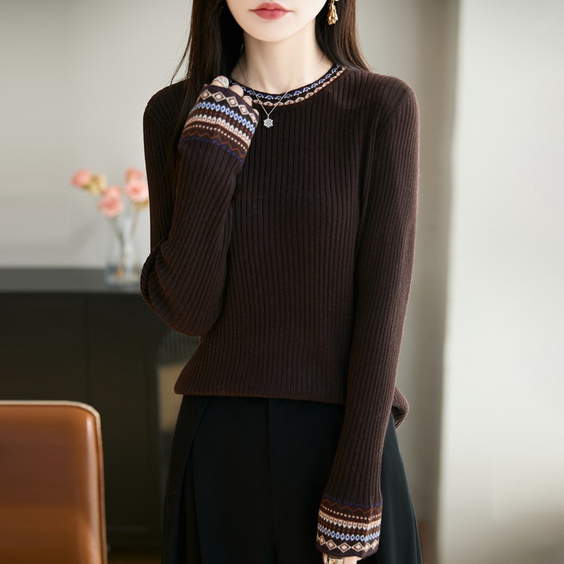 【爆款特价】精纺羊毛复古提花坑条显瘦百搭毛衣·深咖色