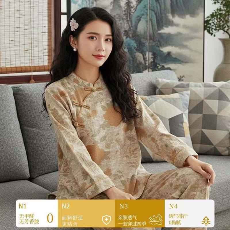 当前位置: 首页 > 服饰 > 内衣 > 睡衣/家居服 > 棉朵妮色织提花立领国风九分袖长裤套装女·花意驼色