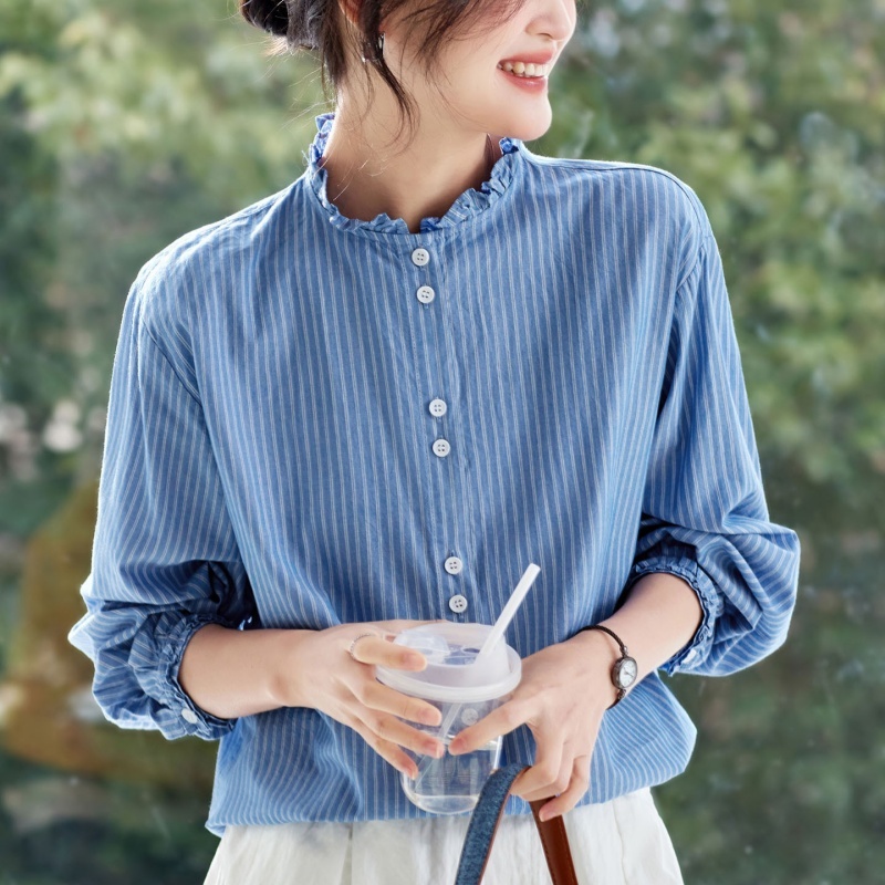 当前位置: 首页 > 服饰 > 女装 > 上衣 > 预售100棉可风各木耳领条纹衬衫61041·蓝条纹