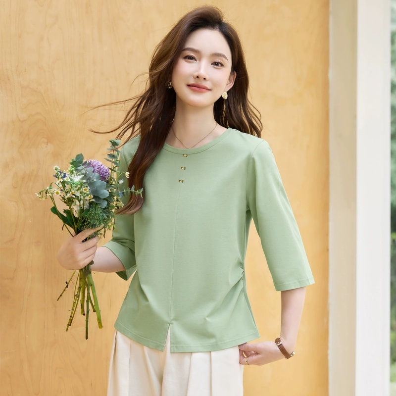 【93精梳棉】轩凌子金属蝴蝶结七分袖收腰T恤XS82610030·豆绿色