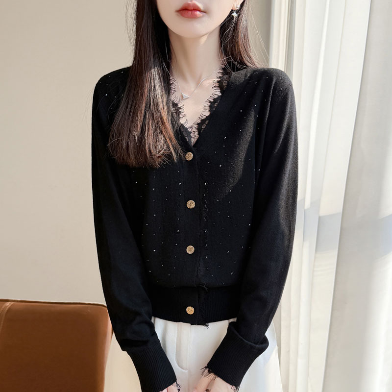 新款精纺羊毛蕾丝拼接设计感洋气显瘦百搭针织上衣·黑色