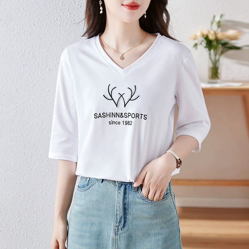 【93精梳棉】轩凌子刺绣V领中袖T恤S82420144·白色