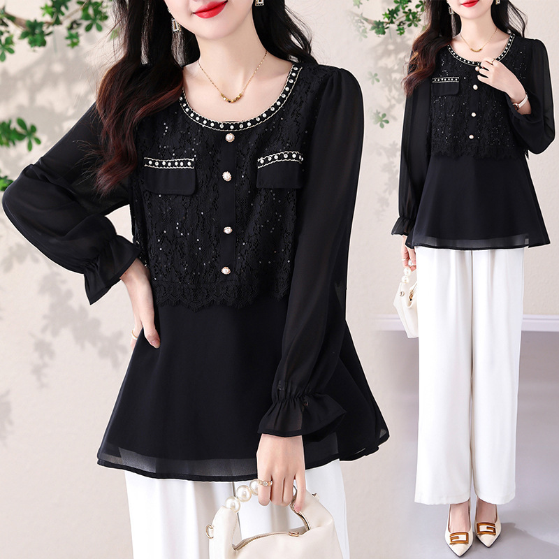 新款蕾丝亮皮拼接假两件宽松显瘦圆领雪纺衫·黑色