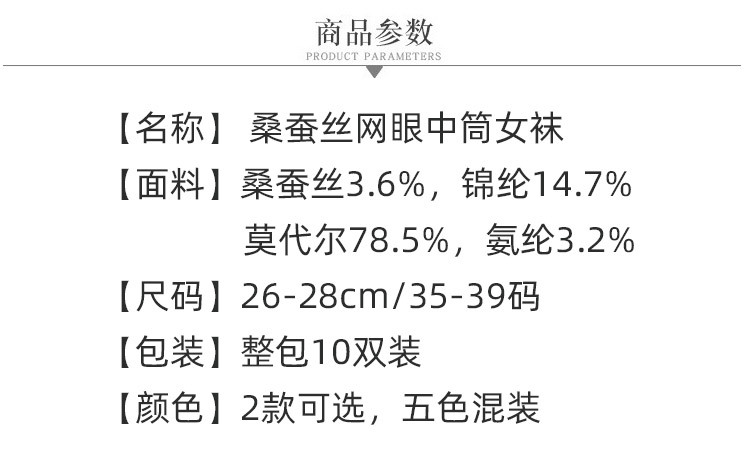 当前位置: 首页 > 服饰 > 内衣 > 袜子 > 【新款升级10双组】天然桑蚕丝莫代尔舒适透气网眼中筒男女袜·款式三(女款混色10双)