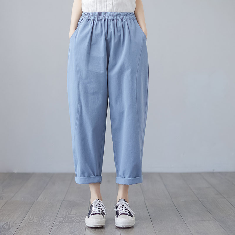 新款纯棉文艺复古高腰阔腿显瘦九分哈伦裤·雾霾蓝