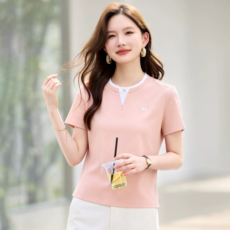 【92精梳棉】轩凌子假两件小V领刺绣短袖T恤XS82620059·藕粉色