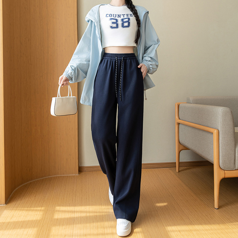 高品质舒适棉松紧腰口袋抽绳宽松显瘦弯刀阔腿裤·藏青