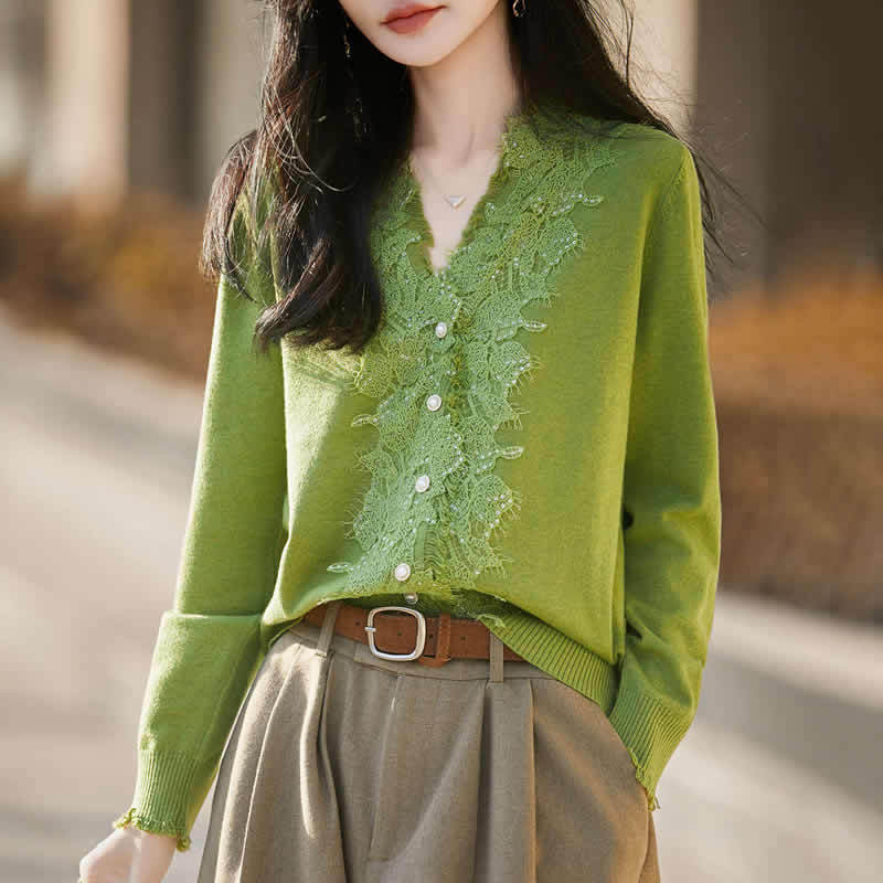 丁摩 桑蚕丝羊毛法式蕾丝拼接V领针织开衫女NS-6006-68·春辰绿