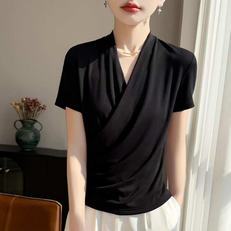雀说 精纺莱赛尔法式V领纯色交叉气质时尚短袖T恤YT-A311·经典黑