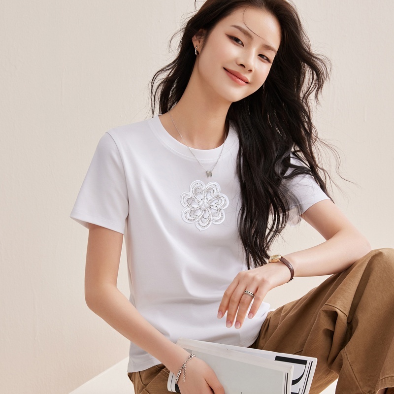 【80S丝光长绒棉】修娴重工亮丝花朵钉珠刺绣T恤W45·白色