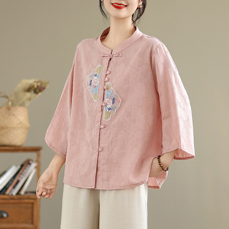 棉麻刺绣复古盘扣气质显瘦上衣·粉色上衣