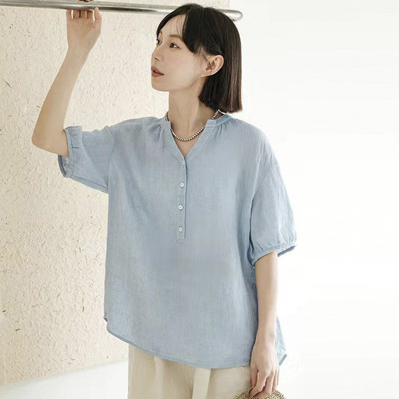 【新款特价】棉麻透气文艺复古宽松显瘦百搭上衣·蓝色
