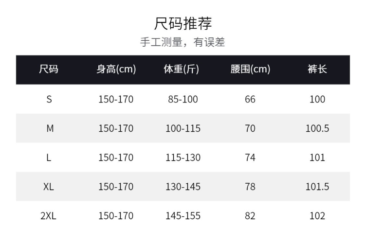 2XL【推荐145-155斤】 L【推荐115-130斤】 S【推荐85-100斤】 M【推荐100-115斤】 XL【推荐130-145斤】 尺码表