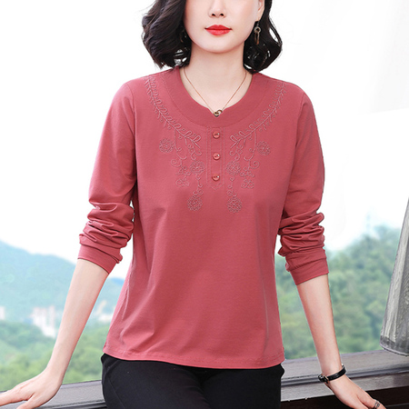 【95纯棉】新款刺绣宽松显瘦百搭圆领长袖上衣·西瓜红