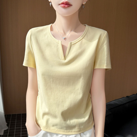 新款92纯棉质感透气设计师V领气质短袖·黄色
