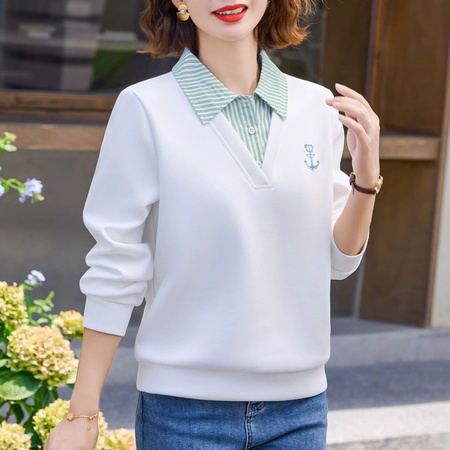 轩凌子假两件翻领刺绣卫衣S82530061·白色