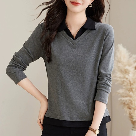 【92精梳棉】轩凌子假两件V领T恤S82430124·花灰色