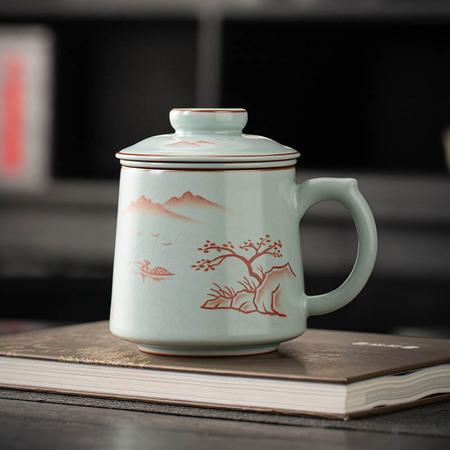 大容量手绘汝窑盖杯办公杯(带茶漏)·吕承明-远行杯 天青